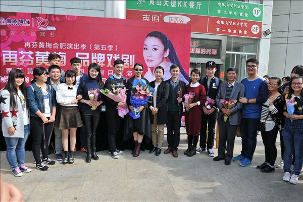 现场一位同学表示,我是韩再芬老师的忠实粉丝,我为安徽拥有黄山和黄梅戏而骄傲,这张爱心票能给了我们普通学生一次感受高雅艺术的机会,今天亲眼目睹韩再芬老师,我也被她的亲和和温暖所打动,觉得非常幸运。签售会结束后,韩再芬老师亲切地与我院师生合影留念。