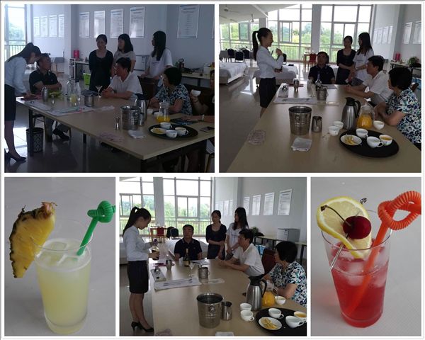 钱晓慧老师介绍,今年的国赛要求选手在现场抽签调制一份鸡尾酒(五种酒水选其一)。对照国赛要求,程凯丽同学和钱晓慧、吴升旸、王晶亮三位指导老师精心研究五种鸡尾酒的调制方法,刻苦训练技法和调配手感。根据胡戴新、余敏的现场随机指定,程凯丽同学调配了椰林飘香和新加坡司令等两种鸡尾酒,展示了流畅的操作、得体的微笑、专业的手法,得到了院领导的肯定。