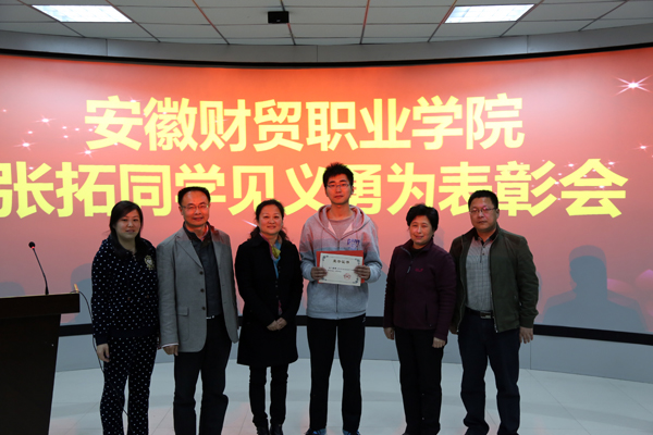 3月29日,张拓等同学前往合肥市植物园踏青游玩,突遇一女孩不慎落水。张拓冒着生命危险跳入水中,与他人合力将落水女孩救起,因抢救及时落水女孩无生命危险。连日来,张拓见义勇为的事迹在全院师生中产生了积极的反响,多家媒体进行了采访报道。同学们纷纷表示,要以张拓作为学习的榜样,大力弘扬社会美德,积极传递爱心正能量,为营造和谐文明的校园新风尚贡献自己的力量。