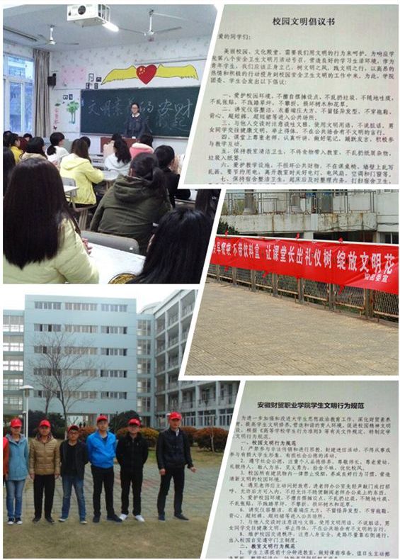 近日,针对学院领导值班过程中发现的同学们上课带早餐进教室、迟到、课堂玩手机等不文明现象,学院团委开展了校园广播播报、横幅标语宣传、发出文明倡议、团学干部值班、各级团学组织动员等一系列教育宣传活动,号召同学们做有文明有礼的安财贸好青年。