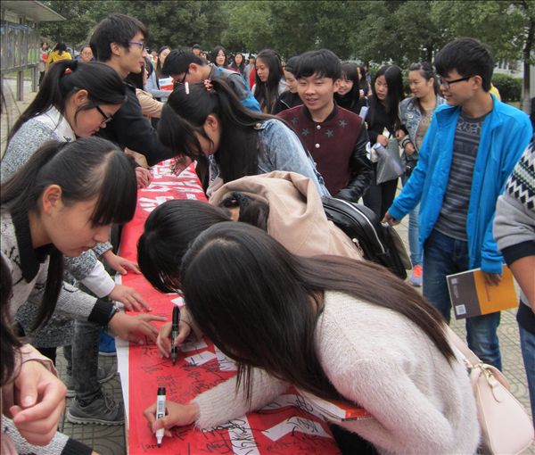 同学们都踊跃地在“立身以立学为先,立学以读书为本”的红色横幅上签名,长长的横幅满载着同学们对知识的渴望与追求,许多老师也参与进来,更是让此次活动锦上添花。“立身以立学为先,立学以读书为本”的横幅将在图书信息中心二楼展厅进行巡展,以提醒同学们形成爱读书、终身学习的氛围,齐享阅读快乐。