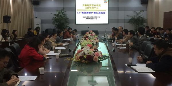 会上,余敏介绍了平台目的、基本功能。电子信息系副主任、该平台项目开发主持人张成叔对该平台的由来、2.0的开发目的、开发计划、基本框架和教室资源管理模块的基本功能做了介绍,并对该平台的桌面端(WWW.AFTVCDMP.COM)和手机端APP(360手机助手搜索下载“掌上安财贸”)做了详细的上线使用培训。