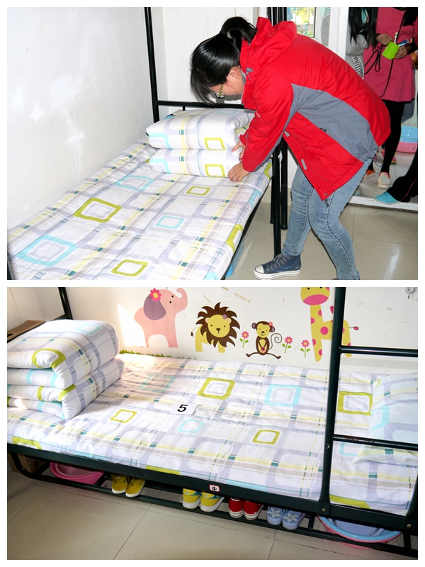 管理员们在学生宿舍快速熟练地铺床叠被,以便实际指导学生。