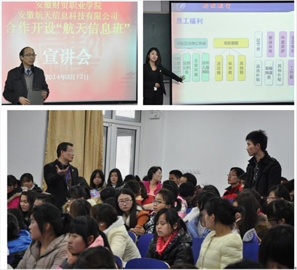 学院“航天信息班”是在学院与安徽航天信息科技有限公司战略合作伙伴关系的背景下成立的,旨在深入推进校企合作,实现学生定向培养并为企业输送优秀人才。3月12日,安徽航天信息科技有限公司人力资源部和学院电子信息系联合为我院“航天信息班”做了细致且富有吸引力的宣讲,电子信息系张成叔副主任和安徽航天信息科技有限公司综合部肖微经理、人力资源部王应祥经理分别代表校企双方对“航天信息班”的由来、组建形式和就业形式做了具体的解释。