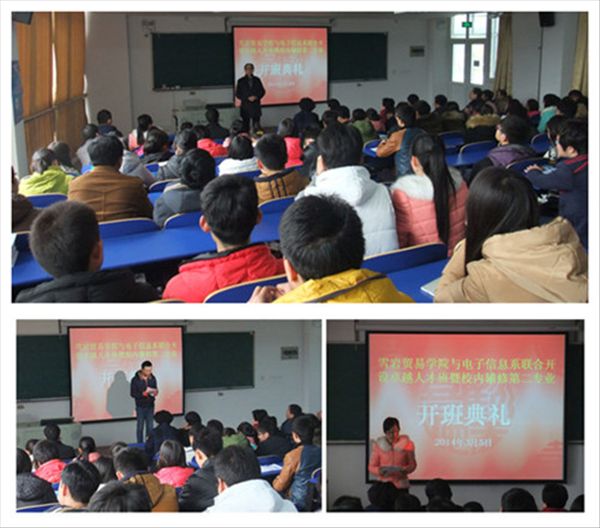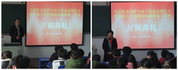 3月5日下午,电子信息系和雪岩贸易学院联合开设的卓越人才班暨校内辅修第二专业开班仪式在6101教室召开。开班仪式由电子信息系副主任张成叔主持,教务处处长余敏、学生处处长薛卫敏、雪岩贸易学院院长郭湘如和党总支副书记胡宏萱、电子信息系党总支书记程众和系副主任姚成出席了开班仪式。两个院系的部分骨干教师、卓越班教师和全体卓越班同学参加了开班仪式。