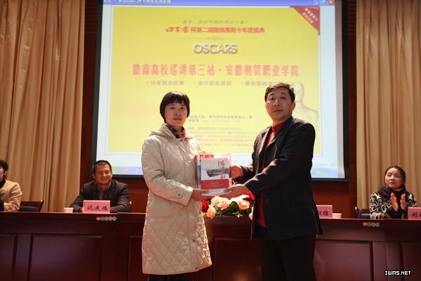 12月5日下午,口子窖杯第二届徽商奥斯卡年度盛典系列活动之徽商高校巡讲第三场在我院举行。第二届徽商奥斯卡年度盛典“十大返乡投资”候选人沈庆伟、“十大徽商名媛”候选人刘战鹰与我院学子们分享自己的人生经验以及创富故事。学院党委书记孙永,学院党委副书记、副院长胡善珍以及徽商杂志社运营总监许以信等共同出席了活动。学院团委副书记朱玫林代表学院接受了徽商杂志社赠送我院的《徽商》杂志和最新出炉的徽商丛书。