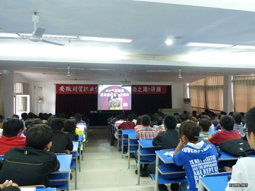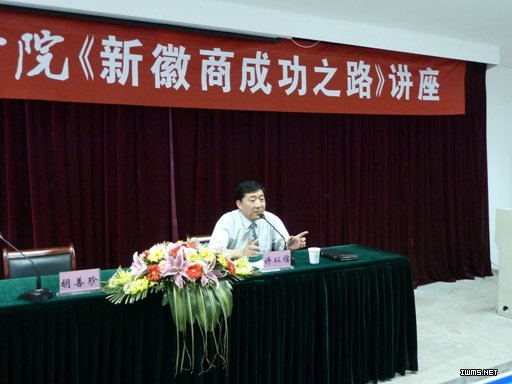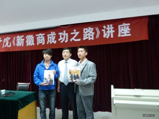 讲座以“首届徽商奥斯卡年度盛典颁奖晚会”开场,展示徽商人的骄傲。“徽商十大领袖人物”、“徽商十大新锐”、“十大返乡投资徽商”、“徽商十大名媛”的颁奖词深深地感染了在场的同学们。之后,许以信总监通过讲述个人成长的历程,以及列举当代徽商成功企业家正威国际集团董事局主席王文银的创业史、当代大学生张宏安创办徽商网站的成功案例,将新徽商的成功人士成就事业的感悟与同学们分享。他对同学们提出了四点希望:一是要担当责任。大学生应承担起对家庭、对社会的责任;二是要准确定位。要从最工作基层的岗位做起,做任何事都用心、留心,把每一件事情做到极致,抓住今天为明天铺垫;三是要有梦想。每个人的内心都要有一个最真实的梦想,锁定努力目标,不断创新进取,努力就有收获,只要是金子一定能发光;四是要奋斗。事业的成功来自勤奋、坚持、努力,同学们要从容就业、理性择业、激情创业。许总监告诫同学们,每天都要问自己:我想要干什么,我能干什么,我该干什么。他希望同学们牢牢把握人生的昨天、今天、明天,善于总结,翻过昨天,抓住今天,规划明天,真正实现自己的人生目标。整场讲座历时近3个小时,会场秩序井然,同学们专心聆听、热情互动,对许总监精彩的演讲不时报以阵阵掌声。