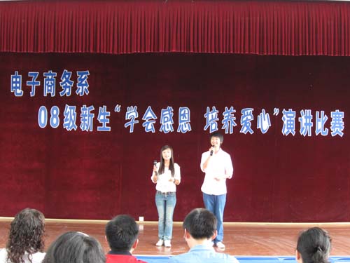 [dvnews_page] 9月17日中午12:30,学院电子商务系在5103教室举办了08级新生“学会感恩 培养爱心”演讲比赛。邓庆安、宋凌云、徐明、张少兵、徐莲等老师作为本次比赛的评委出席大赛。此次大赛共有22位选手参赛,为贴合我院“五阶段五主题”的教育理念,以“感恩、爱心”为主题进行演讲。同学们饱含感情、积极向上的演讲风格赢得了台下阵阵掌声,最终连锁0801班俞凌宵同学荣获本次大赛一等奖。大赛最后由徐明老师点评,她给予了同学们充分的认可,并寄予了殷切的希望。