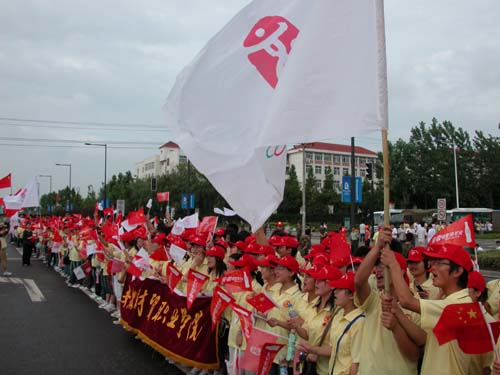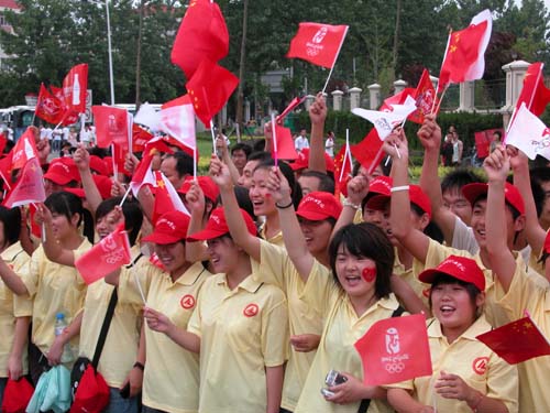 清晨六时,同学们身着统一服装,手持国旗、院旗,激情昂扬、秩序井然地来到观看指定地点。阴雨天气顷刻转晴,烘托出我院师生喜迎奥运的热情。同学们打出“点燃圣火 传递关爱”的标语,表达对四川灾区的关爱和对奥运的祝福之情。当奥运火炬手从学院方阵前经过时,同学们的兴奋之情达到顶点,现场气氛达到高潮。同学们“中国加油,四川加油,奥运加油”的声浪此起彼伏,不绝于耳,手中的国旗、奥运会旗迎风飘展,激情四溢。