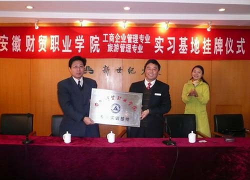 基础部主任王静、工商管理系副主任唐学华、国际贸易系副主任郭湘如及新世纪商务酒店代表参加了挂牌仪式。