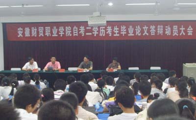 [dvnews_page] 8月27日下午,我院首届自考二学历本科段考生毕业论文答辩动员大会在5102教室举行,教务处余敏副处长主持会议。安徽财经大学成人教育学院李尚红副院长、刘天明主任、朱建文主任出席大会,并对答辩的总体情况和具体操作流程等事宜做了详细介绍。会后,500余名考生进行了论文答辩次序抽签。