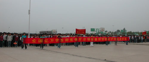[dvnews_page]4月29日上午10时,学院组织全体学生在操场集体收听“全国亿万学生阳光体育运动”北京现场启动仪式的现场转播,会后各系组织学生开展了一小时的集体体育活动。