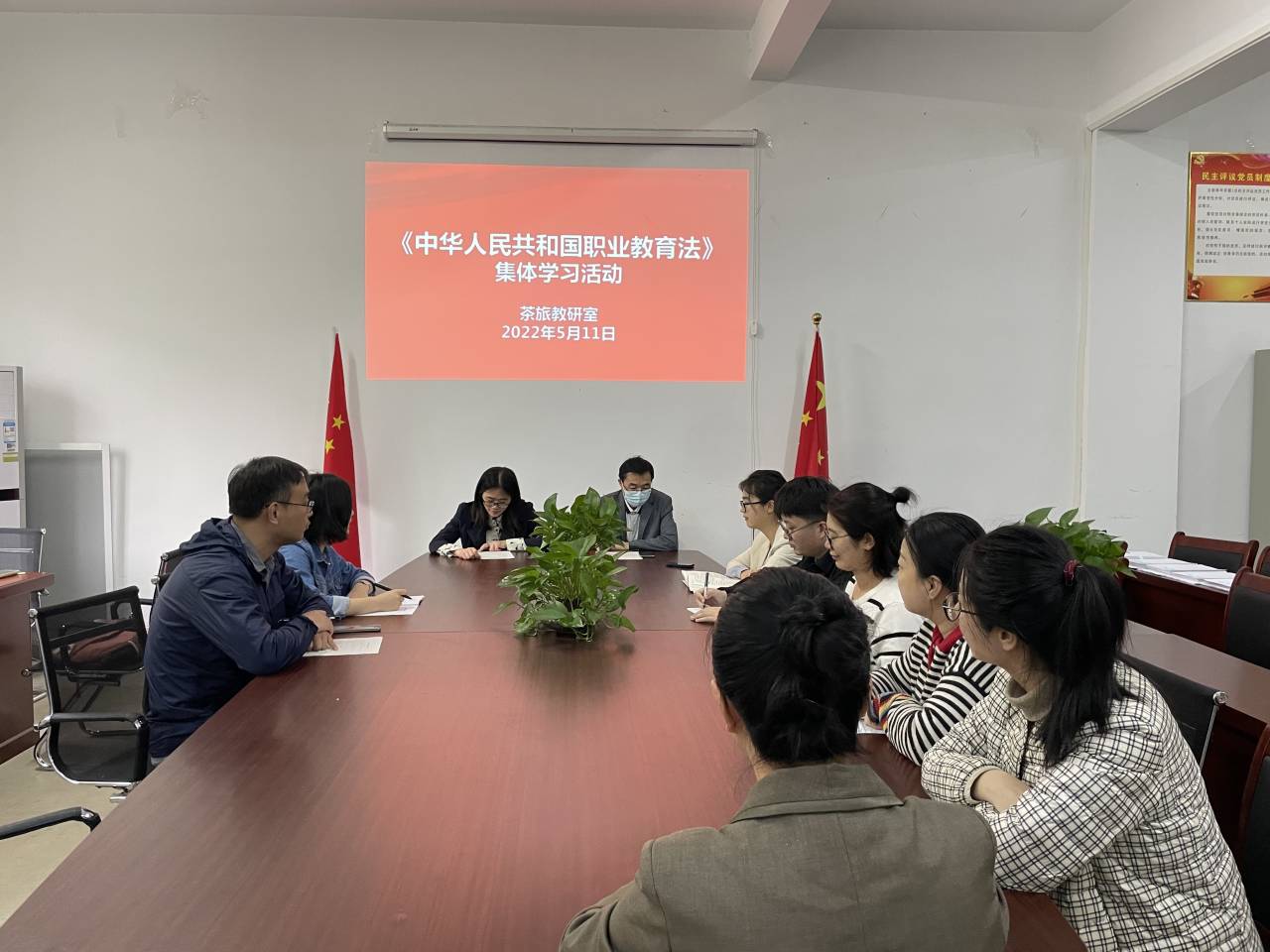 5月11日下午,文化创意学院开展教师业务能力提升学习会。茶旅教研室主任钱晓慧、数字媒体艺术教研室主任胡杨分别组织本教研室全体老师学习了《中华人民共和国职业教育法》,会议在综合楼210举行。