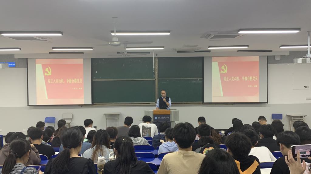 成诚作为我院第53期党课班的一员,从自身的教师职业和社会人的角度出发,阐述了自己渴望加入党组织的愿望,理性解读组织入党与思想入党的庄严性与神圣性。同时以广大学子关注的好工作为切入点,围绕入党动机不正确的主要表现、端正入党动机的主要方法、新时代应积极投身伟大斗争三个方面进行主题分享。成诚指出广大共青团员要“用敏锐的眼光观察社会、用清醒的头脑思考人生,用智慧的力量创造未来”。他强调,端正入党动机要不断加强理论学习、积极参与实践锻炼、勇于自我革命、自觉担当尽责,在日常学习、生活和工作中做理想远大、信念坚定的先锋模范。