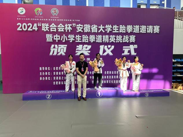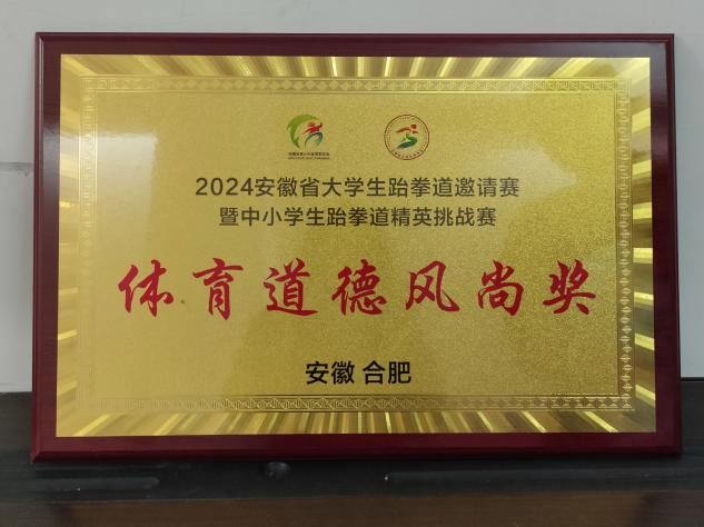 近日,2024年安徽省大学生跆拳道邀请赛暨中小学生跆拳道精英挑战赛在安徽职业技术学院圆满落幕。我校曹子佳、杨雨翔、孙同研三位同学在本次比赛中取得4金3银2铜的优异成绩,学校荣获体育道德风尚奖。
