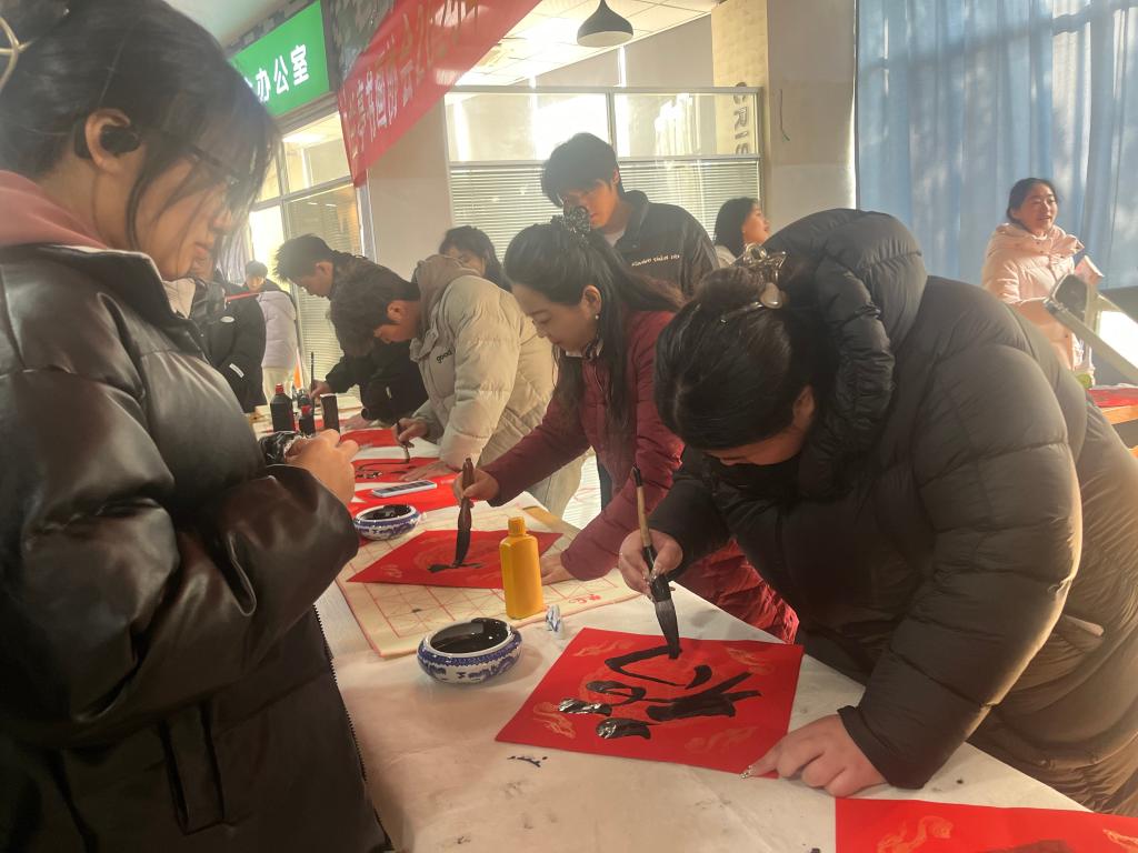 活动现场人头攒动,喜气洋洋,师生们有的笔走龙蛇,行云流水般写下端庄秀丽的楷书福字;有的笔力遒劲,一气呵成地写出飘逸洒脱的行书福字;还有的选用古朴典雅的隶书,展现出独特的艺术风采。