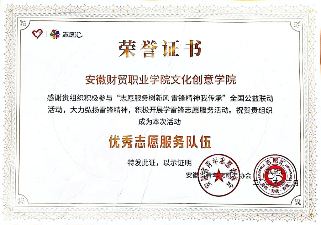 日前,在安徽省青年志愿者协会和“志愿汇”平台联合开展的“学雷锋全国公益联动”评选活动中,文化创意学院荣获“优秀志愿服务队伍”称号。