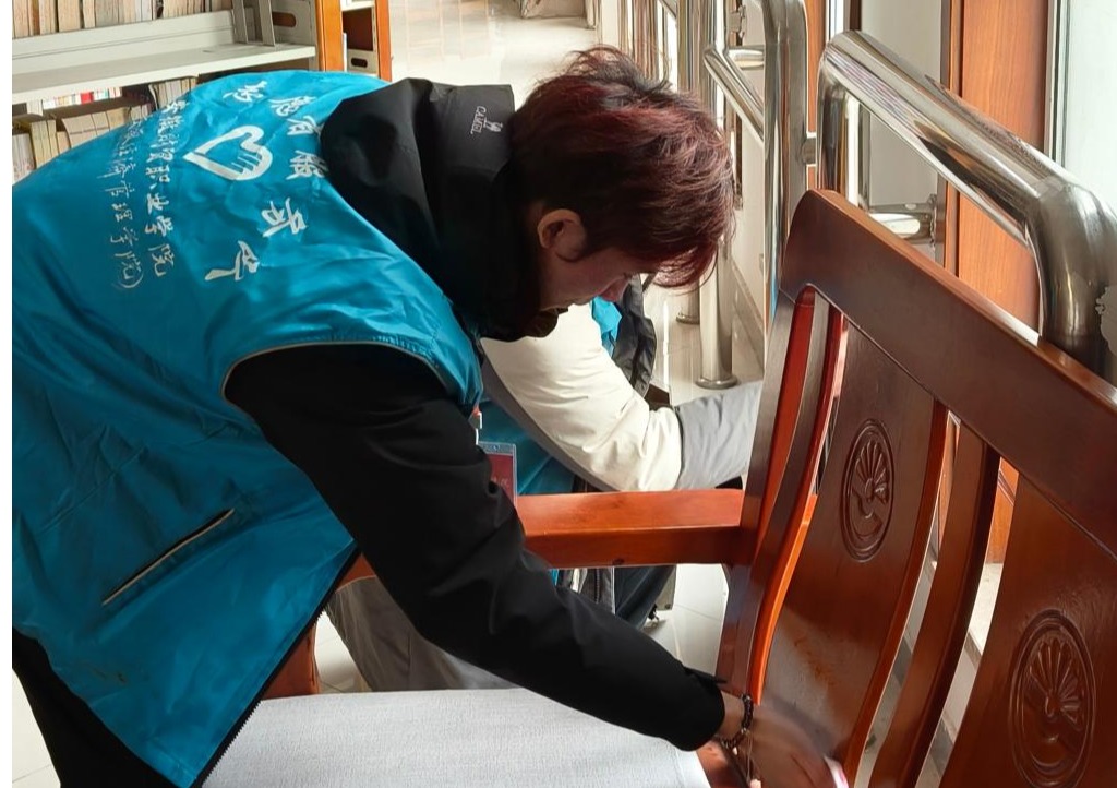 活动现场,志愿者们身着鲜亮的红色志愿马甲,手持清洁工具,按照预先分组迅速投入工作:有的耐心擦拭自助借还书机、公共查询终端等常用设备,让公共设施褪去浮尘、光洁如新;有的在图书馆老师的指导下,对报刊室的杂志、书籍逐一分类整理,将散落的刊物重新归位、排列整齐;有的则重点清理桌椅缝隙、窗台角落等容易被忽略的卫生死角,不放过任何一处积尘和杂物。