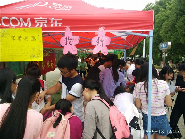 游园会现场人员如织、十分热闹。根据同学们的喜好,此次游园会共设置了你猜我画、火眼金睛、成语接龙、诗词达人、字谜竞猜等五个活动项目,同学们在活动中不断挑战自己的汉字词语及文学储备量,寻找汉字的美丽,复习和回味文学的魅力。