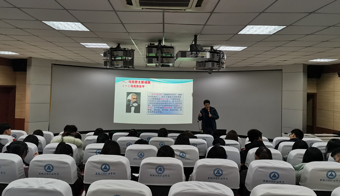 12月16日下午,“青马工程”培训班第四讲在3D实训室开讲,学院团委特别邀请了马克思主义学院院长王良斌作了题为《马克思主义中国化的历程与启示》辅导报告,80余名团学干部聆听了报告会。