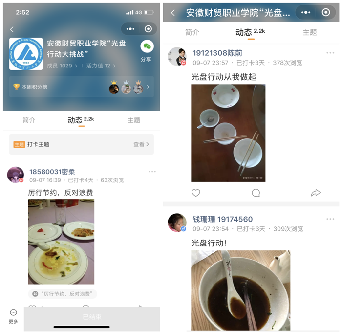 举办“光盘行动大挑战”线上接力活动。学校团委学生会通过微信“小打卡”程序,在全校范围内开展“光盘行动大挑战”活动,由学生自发拍摄在家中或者在餐厅就餐后的光盘照片,上传到beat365在线唯一官网“光盘行动大挑战”打卡圈子,参与光盘挑战,以轻松娱乐方式带头强化节俭自律意识,倡导合理消费,培养学生勤俭节约的良好美德。截止目前,累计参与挑战学生人数达2200人次。