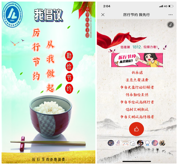 发起“厉行节约 从我做起”倡议活动。为呼吁广大师生适度消费,节约用水用电,学校团委通过制作H5微传单向全校师生发起“厉行节约,从我做起”倡议,号召广大师生树立正确价值观念,身体力行,从自身做起,节约每一度电、节约每一滴水、节约每一粒粮、节约每一张纸、节约每一分钱。鼓励广大师生积极行动,争做“厉行节约、反对浪费”的践行者、宣传者、推动者,截止目前,参与“厉行节约,从我做起”线上点赞助力师生达1812人。