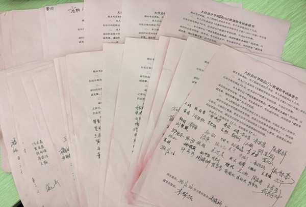 诚信承诺,营造氛围。1月12日,大位会计学院组织学生签订《诚信考试承诺书》,承诺在考试中端正考试态度,自觉遵守考试纪律,做到诚信考试。