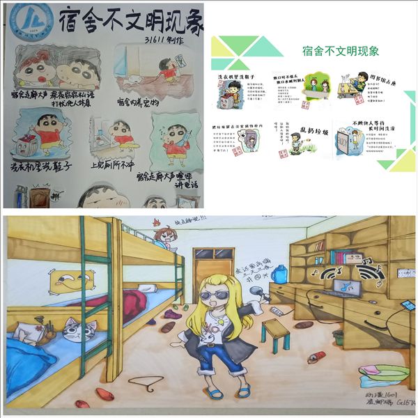3月16日晚,宾虹艺术学院动漫协会组织了宿舍不文明现象手绘大赛,本次大赛以手绘作品和电子海报两种形式。宾虹的学子们发挥想象力,以夸张、讽刺、幽默等艺术表现形式反映校园生活中的美丑瞬间,意义深刻。经过评审,手绘组31611寝室集体制作获得一等奖,电子组装饰1502金蕾获得一等奖,此次活动不仅提升了宿舍文化的内涵,更展现了新一代大学生的思想风采。