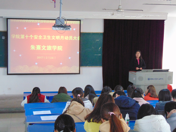 2月24日,朱熹文旅学院在5102教室召开学院第十个“安全卫生文明月”动员会。朱熹文旅学院党总支副书记宋凌云、学生秘书汪双及专职辅导员出席会议,该院全体团学干部及寝室长参加会议。