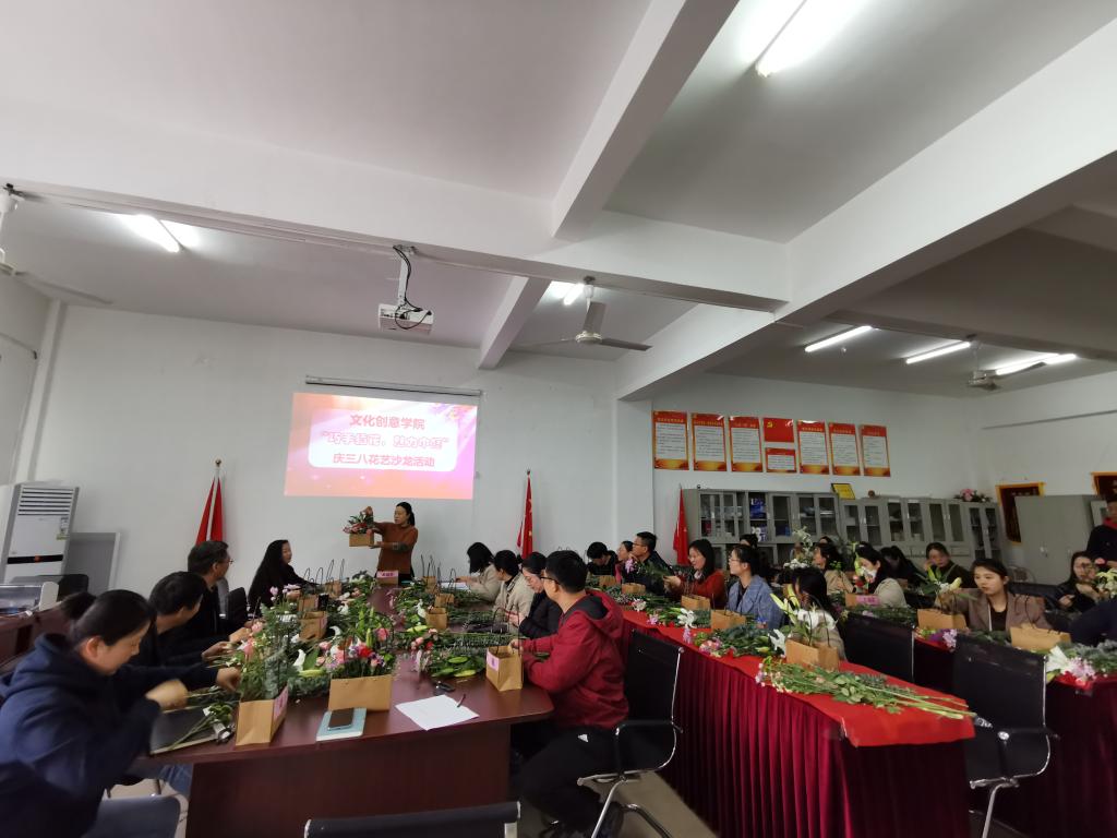 花香春意浓,巾帼绽风采。3月17日下午,文化创意学院在教师办公室举办“巧手插花 魅力巾帼”庆三八花艺沙龙活动。学校工会副主席许卫民、文化创意学院全体教职工参加了活动。