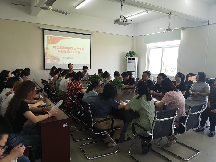 会上,李健介绍了15名预备党员在预备期的基本情况,随后,预备党员们就思想、学习、工作、生活等方面向党组织做了汇报并宣读了转正申请,表示今后会更加严格要求自己,不断充实完善自我、提高理论水平,在新时代下做敢担当、勇担当、真担当的优秀党员。与会党员经过充分评议投票,一致同意15名预备党员按期转正为中共正式党员。财会金融学院党总支书记胡宏萱向按期转正的15名预备党员表示祝贺,并提出殷切希望,要时刻牢记党员身份,永葆入党初心,加强政治理论学习,不断提升党性修养;要始终以党员标准严格要求自己,充分发挥党员先锋模范带头作用,以实际行动践行全心全意为人民服务的宗旨;要持续加强“四史”学习,要在真学真信中坚定理想信念,在学思践悟中践行初心使命。(供稿:沈丽萍 审稿:李健)