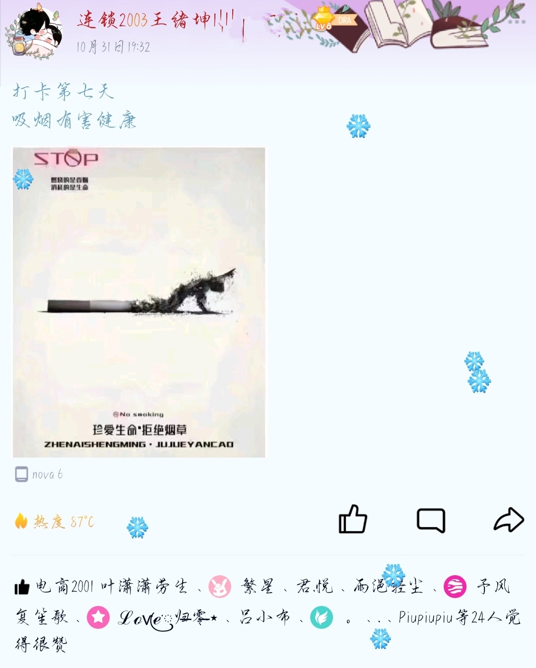 开展打卡活动,加强宣传引导。校团委组织各班级团支部举办关于QQ空间发布禁烟宣传说说的打卡活动。通过网络宣传的方式让同学们了解到吸烟的危害,更好地创造文明健康的校园环境。同学们积极参与到此次发布禁烟宣传说说的打卡活动中,进一步增强了同学们的禁烟意识,起到了积极的引导效果。
