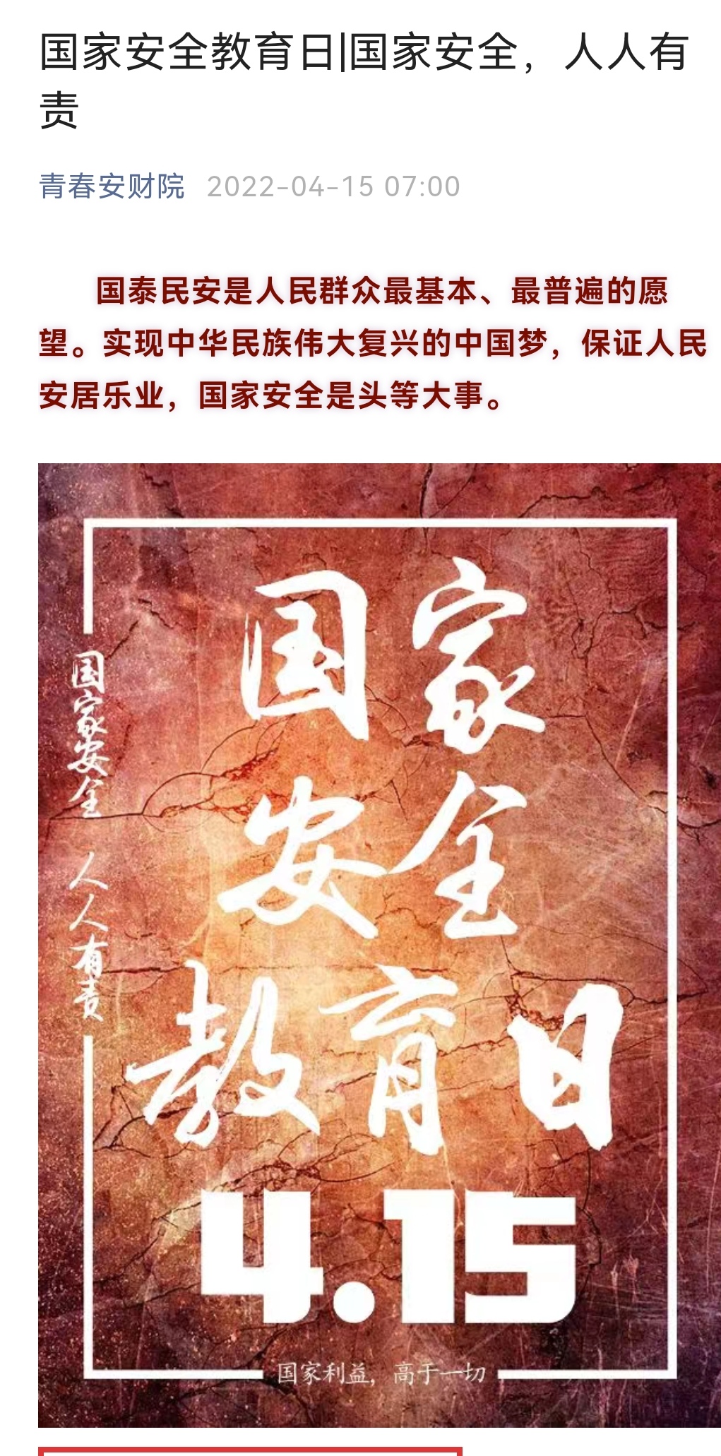 国家安全,人人有责。校团委积极落实对国家安全教育日的宣传工作,通过“青春安财院”微信公众号、团委抖音平台和校园广播等形式,大力宣传相关知识,引导大学生积极遵法守法,维护国家安全。