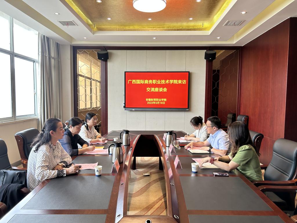 王海龙对广西国际商务职业技术学院来访表示欢迎,简要介绍了学校的办学情况,并就教学管理、教科研成果、大赛激励、以及“双高校”建设等方面进行了交流和探讨。陆纯梅介绍了广西国际商务职业技术学院的情况及来校考察目的,对学校的热情接待表示感谢,充分认可学校的办学特色和育人成效,她希望今后两校能加强沟通合作,通过经验借鉴、资源融通等形式,携手同行。