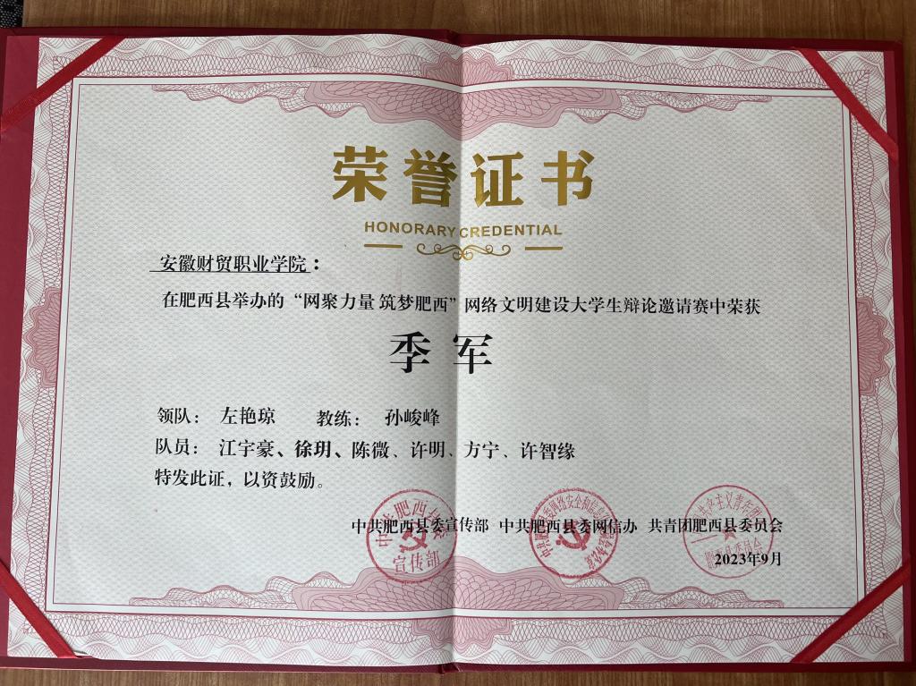 比赛由初赛、半决赛和决赛三个部分组成。各高校辩手分别围绕“网络的发展对文学的影响的利弊问题”“网络的发展的娱乐性与实用性问题”以及“大数据推送对用户的利弊”等辩题进行激烈辩论。辩论赛中,同学们用事实和数据来支持自己的观点,唇枪舌剑,据理力争,思维火花不断碰撞,在相互切磋中对网络文明建设有了深入思考,有力弘扬了社会主义核心价值观,倡导网络文明新风尚,积极营造风清气正的网络生态。学校参赛队由会计2229班江宇豪、财管2202班徐玥、旅游2201班陈微、旅游2202班许明、人资2202班方宁和会计2201班许智缘等6名同学组成,一路过关斩将,最终在决赛中荣获季军的好成绩。