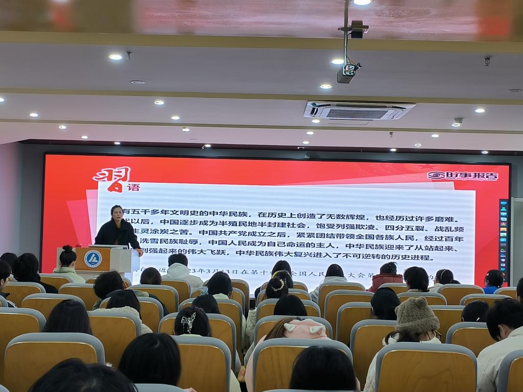 12月11日,文化创意学院党总支副书记倪晶晶走进思政课堂,为青年学子讲授题为《七十五载迎盛世 砥砺前行续华章》的形势与政策专题报告。入党积极分子、23级团学干部等100余人参加报告会。