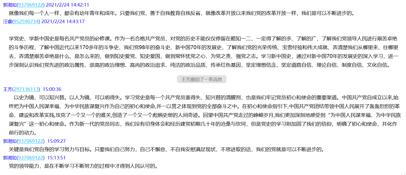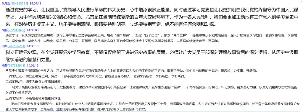 会上,党员教师就自己学习《习近平在党史学习教育动员大会上的讲话精神》和《中国共产党历史》心得感悟展开讨论并积极发言,分享自己的学习成果。其中,张克书记表示:在党史学习教育动员大会上,习近平总书记强调全党同志要做到学史明理、学史增信、学史崇德、学史力行,学党史、悟思想、办实事、开新局!我们要提高思想站位,做到学有所思、学有所悟、学有所得。在学习党史过程中,我们老师有责任、有义务要把党史融入进课堂,要让学生知史爱党,知史爱国;我们要以昂扬姿态、以优异成绩迎接建党一百周年!同时为学校的发展、为学校“十四五”规划开好局贡献力量!