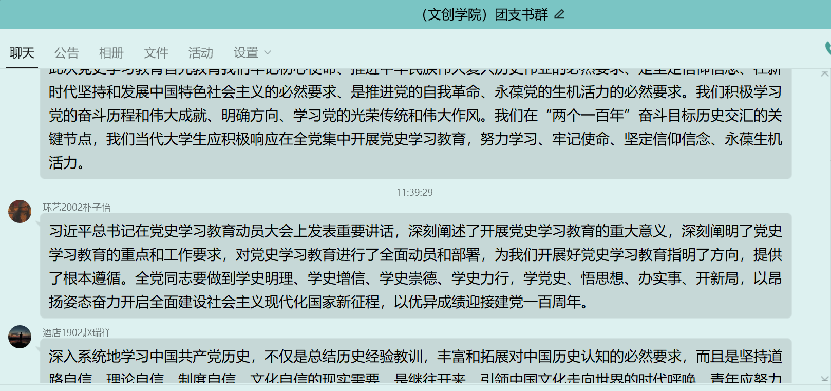 活动利用云参观的方式,通过参观线上展馆(党的一大会址网上展馆)学习党史,并且重点学习了习近平总书记20日在党史学习教育动员大会上的重要讲话精神,参与的同学都通过QQ群分享了各自的学习心得及感悟。通过线上参观、观看视频、云端分享,同学们真切感受到了树立正确的理想信念对新时代大学生成长的重要性。大家纷纷表示一定要树立崇高理想,要以史为鉴,时刻做到“不忘初心、牢记使命”,在前进的脚步过程中,勇担历史重任,实现自我价值,把个人理想和国家发展、民族复兴的目标紧密结合一起,并为此不懈努力奋斗。