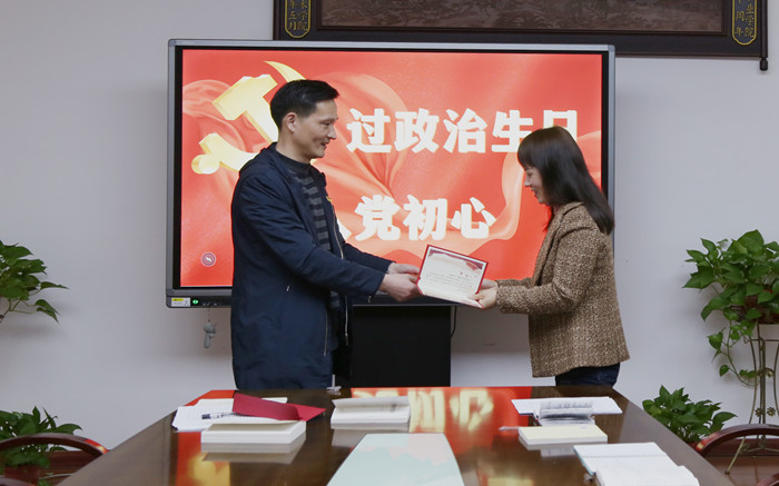党支部为3月入党的王亚丽同志赠送了写着入党誓词、党员姓名和入党时间的贺卡,以及精心挑选的书籍《征途漫漫惟有奋斗》。王亚丽同志结合自己工作生活经历,分享题为《十年征程,不忘初心》政治生日感想。