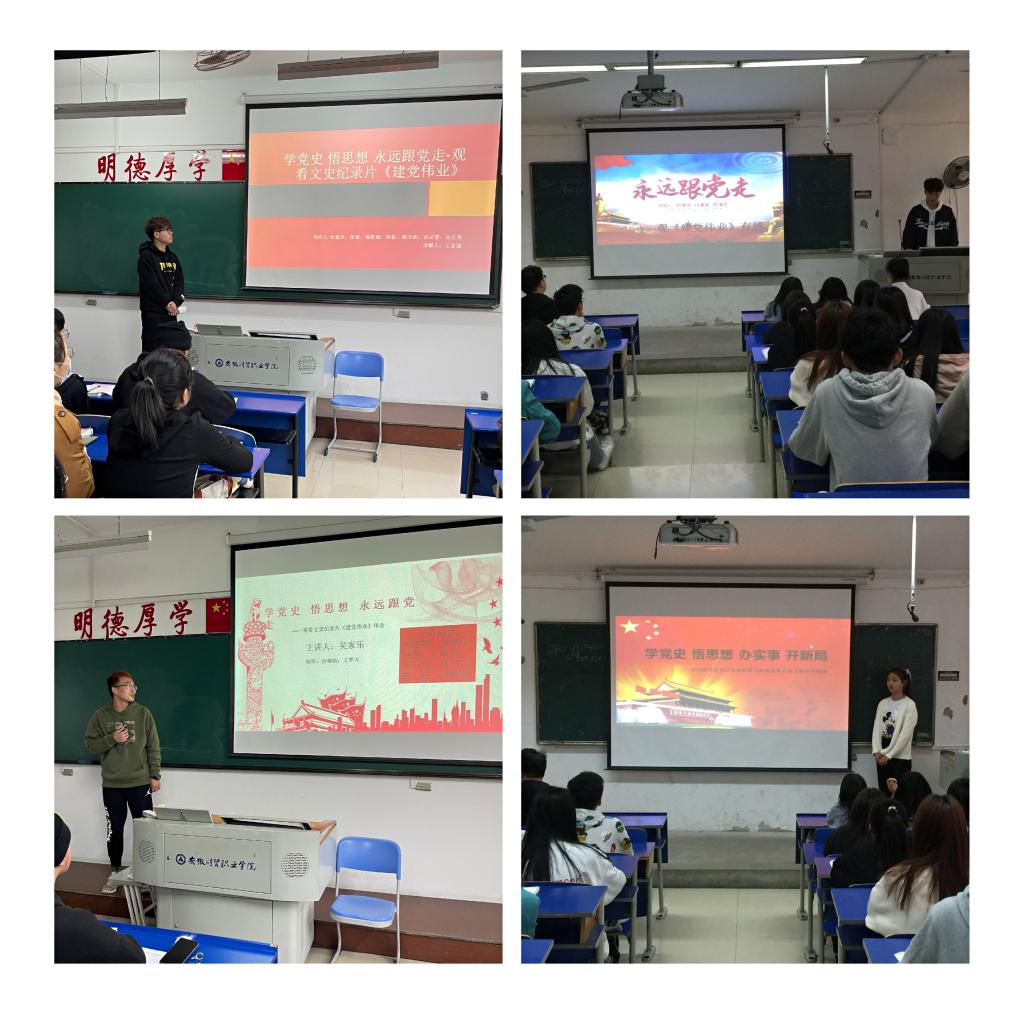 此次活动以集思想性、时效性和感染力为一体的文史纪录片《建党伟业》为教学素材,采用翻转课堂的形式让学生交流学习心得,共悟中国共产党人的初心使命。通过明过去、重现在、展未来三个部分的分享,让学生直观地感知到党创建初期的艰难历程,通过感悟党史,深刻认识到中国共产党为国家和民族做出的伟大贡献,也倍加珍惜当下的学习时光。同学们纷纷表示,此次专题学习活动既为新学期新任务加油鼓劲,也坚定了自觉传承弘扬中国共产党“精神谱系”的信心和决心。