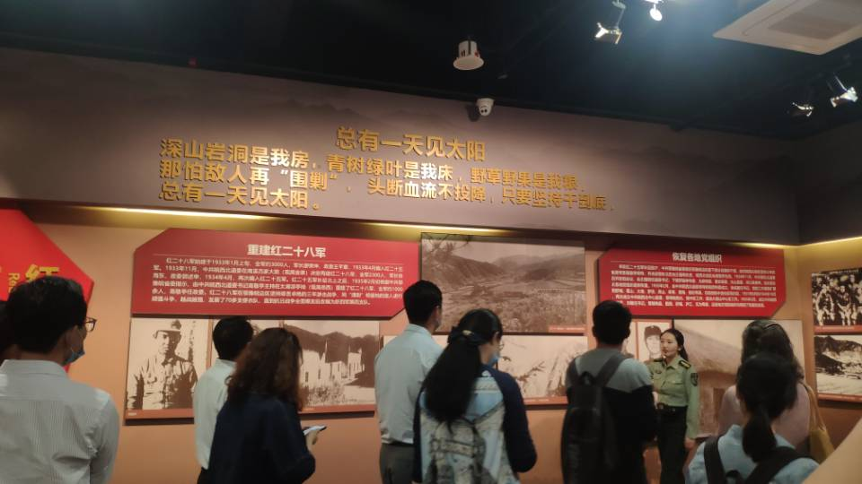 本次活动包括红色文化主题参观、团总支团队建设两部分。下午两点,全体成员到达大别山革命历史纪念馆,大别山是鄂豫皖革命根据地的中心地带,也是中国红军的重要发源地和主要活动区域之一。在讲解员的带领下,馆内以大别山叙事说人为主,分“辉煌历史、将军摇篮、浩气长存、红韵流长”四大版块和“名人荟萃、星火燎原、红旗飘扬、抗日烽火、千里跃进、将军风采、浩气长存、红韵流长”八个单元。采用沙盘、文物、雕塑、图片、油画、文字、场景等形式,运用声光电等现代高科技手段,展示大别山区特别是皖西地区优秀儿女在各个历史时期不屈不挠、前仆后继的革命精神。现场的新、老团员代表佩戴团徽,在革命烈士纪念雕塑下,向革命先烈致以最深情的怀念和最崇高的敬意。