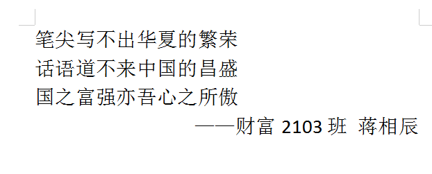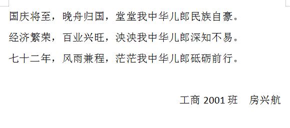 “青春告白祖国,写给祖国母亲的三行情诗。”从百年前的积贫积弱,到今天的国富民强。走在中华民族伟大复兴的道路上,每一名中华儿女都感到由衷的自豪和骄傲。1949年10月1日,当鲜艳的五星红旗冉冉升起,您屹立于世界东方,无数革命先烈用生命和热血誓死捍卫你的尊严。72载沧桑岁月,作为新时代青年大学生,在您的生日之际,安财院青年学子将祝福祖国的千言万语,融入爱国之心与报国之志,凝聚成一首首优美的三行情诗,共同祝福伟大祖国繁荣昌盛。