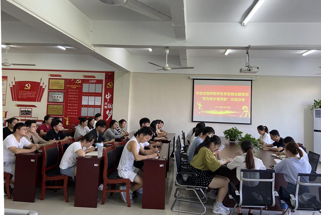 9月26日下午,财会金融学院学生党支部开展“我为家乡做贡献”分享交流主题党日活动,会议由组织委员胡云芳主持,支部书记李健、宣传委员沈丽萍员和全体在校学生党员参会。