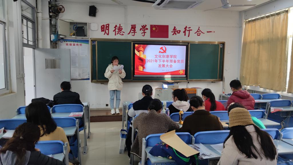 12月8日下午,文化创意学院学生党支部在3104教室召开2021年下半年党员发展大会,大会旨在吸纳优秀学生以壮大党员队伍,为支部发展打下坚实的基础。学生党支部9名正式教师党员、49名党员发展对象以及入党介绍人参加大会,学生党支部书记宋凌云主持会议。