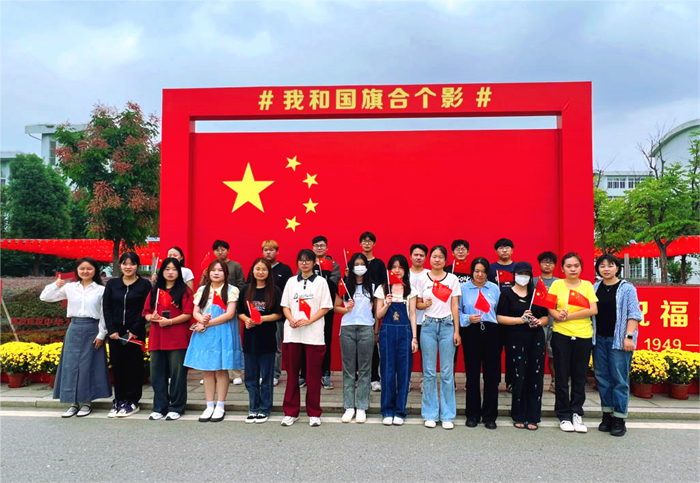 扮靓校园为爱国主义氛围增色添香。排起长队的不仅仅是“我和国旗合个影”景观,教学楼前的两条“国旗路”刚刚装扮好,便迎来了一个又一个2023级新生班级前来拍照,这是他们开启大学生活后的第一张合照,也是进入大学的第一堂室外思政课。上空的红旗迎风飞舞,与青春的笑脸相互映衬,定格成十月最美的风景。结束了国旗路的打卡,2022级工商企业管理专业的樊良好同学便来到“祝福祖国”立体花台前拍照,“看到飘扬的国旗,我感到无比幸运和自豪。在我心中,中国是最美的名字,五星红旗是最美的旗帜。”