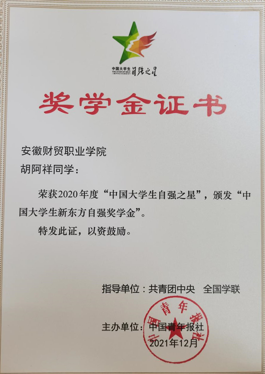 近日,由共青团中央、全国学联指导,中国青年报社开展的2020年度“中国大学生自强之星”奖学金评选活动中,我校信息1901班胡阿祥同学荣获2020年度“中国大学生自强之星”荣誉称号。