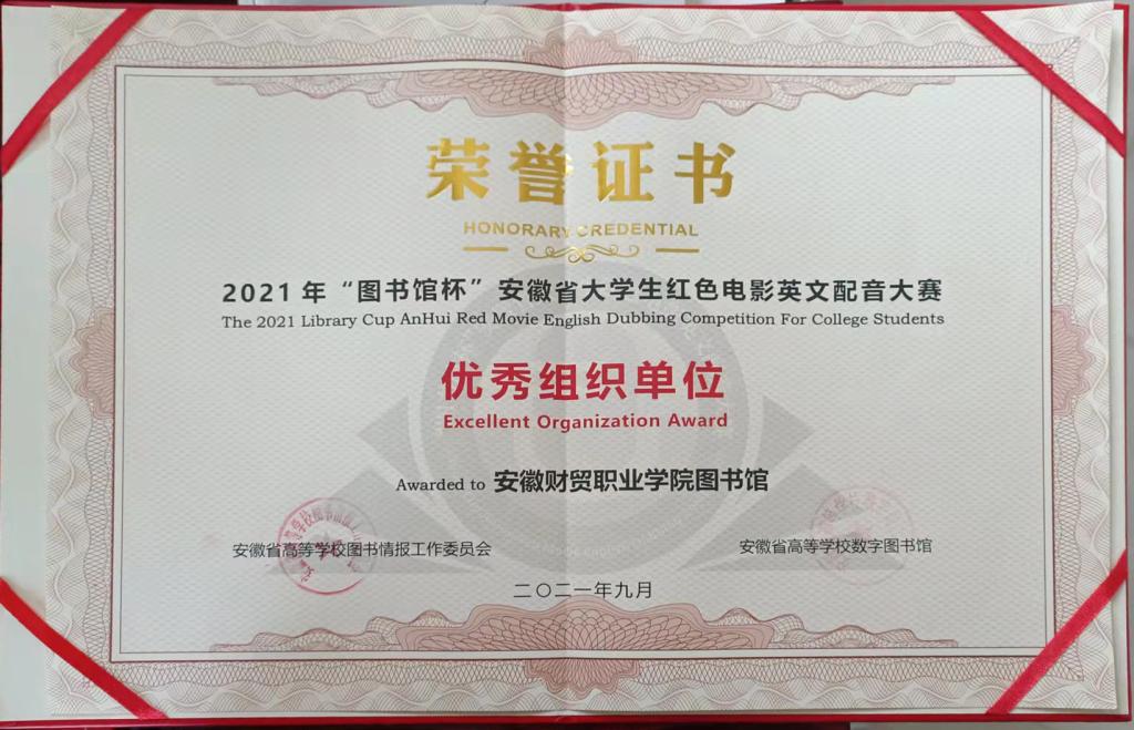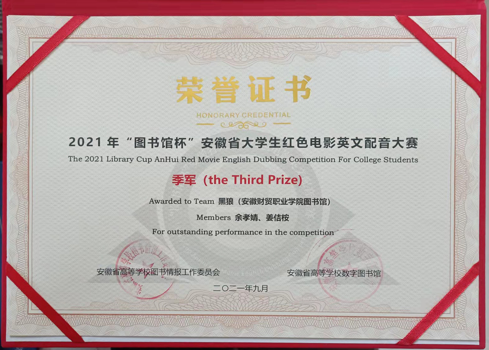 近日,由安徽省高等学校图书情报工作委员会、安徽省高等学校数字图书馆主办,广东粤图之星科技有限公司承办的2021年“图书馆杯”安徽省大学生红色电影英文配音大赛圆满落幕。本次大赛全省共41所高校图书馆参与,共318件作品参与评选,74件作品晋级网络评选,最终组委会专家通过“MET全民英语”平台在线评分产生12组参赛队伍晋级全省总决赛。本次大赛经过学校图书馆层层筛选,推选的2件作品在本届大赛中表现优异,商务英语2003班余孝婧、计算机信息管理2002班姜佶桉团队荣获季军,财务2004班周文、财务2004班李珍团队获优秀奖,学校图书馆荣获“优秀组织单位”称号。
