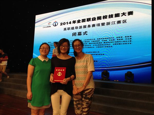 6月17至19日,2014年全国职业院校技能大赛高职组英语导游服务赛项在浙江旅游职业学院隆重举行,共有来自全国30个省(市、自治区)的59名选手参加。我院旅游管理系旅游1201班侯娇娇同学参加比赛,发挥出色,以第20名的总成绩荣获三等奖。