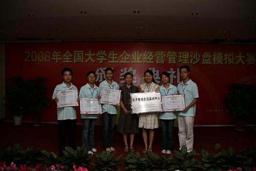 [dvnews_page] 7月16日,由教育部高职高专工商管理类教学指导委员会主办的2008年全国大学生企业经营管理沙盘模拟大赛全国总决赛在杭州落下帷幕。来自全国的22支获得参加国赛资格的院校代表队展开了激烈的角逐,最终,由工商管理系副主任唐学华、专业教师夏媛媛、工商企业管理专业0604班张冬冬、张洁、樊庆、王媛媛及工商0701班谢亚男同学等组成的我院代表队获全国总决赛冠军。同时,我院获“经济管理示范实训中心”称号,夏媛媛老师获“优秀双师型教师”称号。