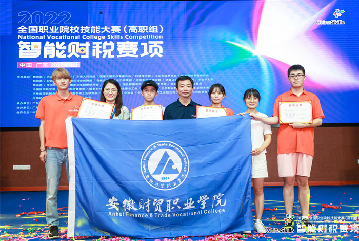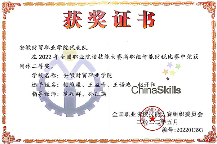 2022年全国职业院校技能大赛高职组智能财税赛项于8月21日至23日在广东水利电力职业技术学院成功举办。由我校财会金融学院会计1903班赖维康、财务1901班王益奇、税务1902班赵开阳、税务1902班王语池组成的beat365在线唯一官网代表队,在教师范颖群、孙红燕的指导下荣获国赛二等奖的好成绩。